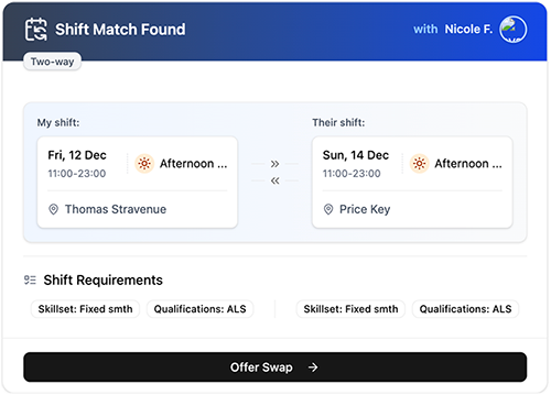 Automation does the work for you, finding perfect shift matches instantly, no messages, no stress.